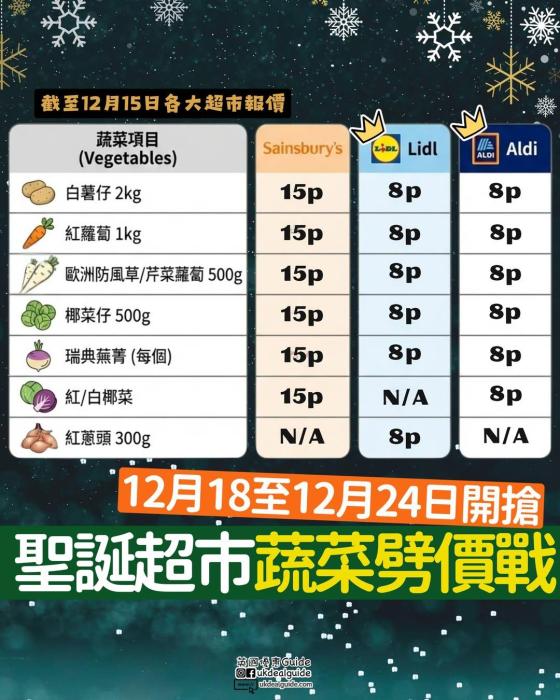 暫時有三間 Sainsbury’s / Lidl / Aldi 公佈競價,由 12月18日 (星期四) 開始至 12月24日聖誕前都可以入貨