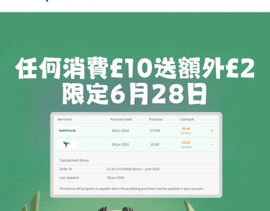 每月一次嘅 TopCashback 消費£10送£2 優惠又嚟啦!
