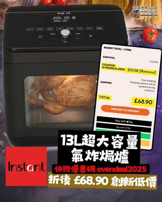 電器優惠 Instant Pot UK 13L 超大容量氣炸鍋+焗爐 By Ukdealguide 2025-08-09 0 Comments Less than a minute 9 months ago Facebook Twitter LinkedIn Pinterest Whatsapp Reddit Print Share via Email https://bit.ly/ovendeal2025 13L 超大容量有大買大 雙層至三層托盤同時煮多款食物 自帶旋轉烤叉令肉類均勻受熱 #實測 可烤大約1.3KG雞快靚正 10合1 功能一機搞掂 氣炸 | 烤焗 | 轉叉 | 多士 | 加熱 | 烘乾 | 發酵 | 燒烤 | 保溫 官方原價 £119.00 快閃優惠碼 ovendeal2025 折後£68.90 創新低價仲平過 PrimeDay #快煮神器#利申用左一年有多 #好用慳電#烹調進度即時顯示 0 Facebook