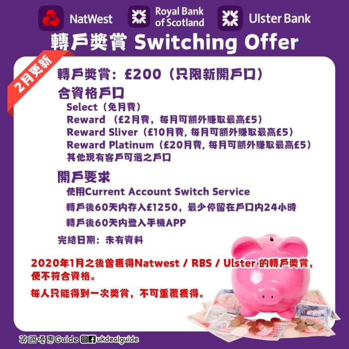 繼Lloyds 送£175後,今日到NatWest 轉戶奬賞有£200 。適用於新開戶口,新舊客戶都適用。而合資格的戶口總類包括Select、Reward、Reward Sliver、Reward Platinum 及 其他現有客戶可選擇之戶口。如你於 2020年1月1日之後曾獲得NatWest / RBS / Ultser 的轉戶奬賞,便不適用於此轉戶優惠。