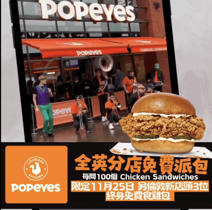 為咗慶祝英國第 100 間分店開幕,Popeyes 下星期二大玩全英派 Chicken Sandwich